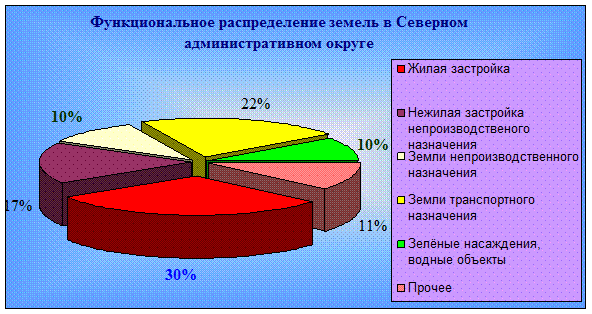 С экологической точки зрения очень важным показателем является относительное распределение земель того или иного назначения, т.е. соотношение земель, занятых жилой застройкой, зелеными насаждениями, промышленными предприятиями и т.д. Очевидно, что благотворное влияние на экологическое состояние территории оказывают парки, скверы, бульвары, водные объекты, и чем большую площадь они занимают, тем благоприятнее и экологическая, и эстетическая обстановка в округе. Напротив, значительная доля территории округа, занятая промышленными предприятиями, автомагистралями и железными дорогами, косвенным образом указывает на вероятную напряженную экологическую ситуацию в округе. Функциональное распределение земель в САО показано на диаграмме.