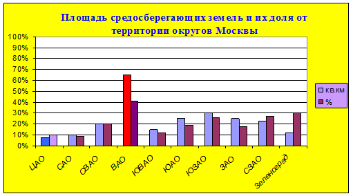 Диаграмма показывает, что только 10% территории округа (969,5 га) занята улучшающими экологическую ситуацию или "средосберегающими" типами земель; по этому показателю Северный административный округ является аутсайдером среди других округов, занимая девятое место в Москве. Тем не менее на территории округа расположены такие любимые москвичами места Москвы как парк Сельскохозяйственной академии им. К.А.Тимирязева, парк Дружбы, обширные водные пространства, оказывающие, несомненно, большое оздоравливающее влияние на экологическое состояние прилегающих районов.