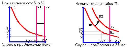 Теперь проанализируем ситуацию на втором рисунке. Первоначально рынок находится в равновесии в точке Е1 при номинальной ставке процента в 7%. Рост номинального дохода сдвигает кривую спроса на деньги в положение D2. Положим, что процентная ставка в данное время равна 5%, и соответственной люди хотят держать на руках 200 миллиардов , но банковская система может предложить лишь 150 миллиардов и центральный банк не намерен увеличивать предложение денег. Население и фирмы предпринимают попытки приобрести больше денег, продавая ценные бумаги. Эти действия приводят к понижению цены ценных бумаг и, соответственно, к повышению номинальной ставки процента до 12%, что обеспечивает соответствование количества денег, находящихся в обращении, количеству денег, хранящихся у населения и фирм в соответствии с их желаниями. Денежный рынок достигает нового положения равновесия. Уменьшение спроса на деньги запускает рассмотренные процессы в обратную сторону.