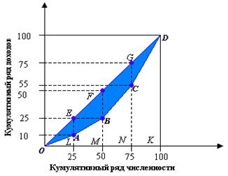Графически изобразить и измерить неравенство доходов можно с помощью кривой Лоренца. Для ее построения отложим по оси абсцисс последовательно просуммированные удельные веса индивидуумов в их общем числе, учитывая, что удельный вес каждого из них составляет ¼, или 25%, а по оси ординат – кумулятивные доли доходов этих людей. Соединив все точки, получим кривую Лоренца (рис.2).