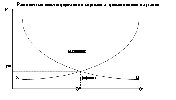 Пересечение кривых спроса и предложения определяет цену равновесия (или рыночную цену) и равновесное количество продукции. Любую другую цену конкуренция делает неустойчивой.
