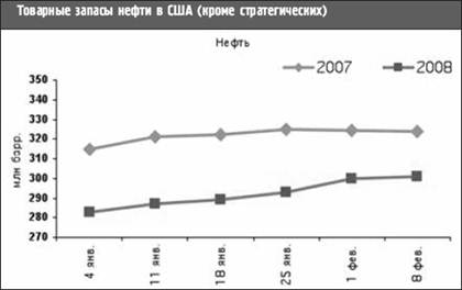 Динамика товарных запасов остается сезонной. Динамика изменения товарных запасов в декабре 2007 года - феврале 2008 года имела сезонный характер. Однако запасы нефтепродуктов в странах Евросоюза и нефти и нефтепродуктов в США сохраняются на более низком уровне по сравнению с аналогичным периодом прошлого года. Запасы нефти в странах Евросоюза в январе 2008 года практически не изменились относительно декабря 2007 года и превысили на 1 % запасы в январе 2007 года. Таким образом, невысокий уровень загрузки НПЗ перед периодом сезонных ремонтов и низкие товарные запасы нефтепродуктов к концу зимы повышают риск сохранения относительно низких запасов и на начало весенне-летнего сезона в Северо-Атлантическом регионе.