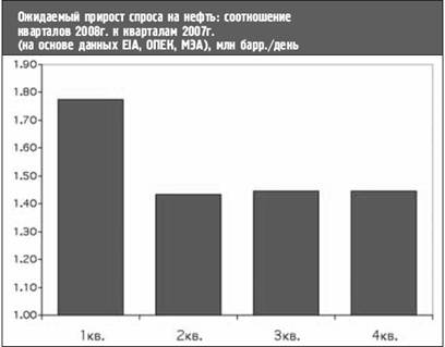 Спрос на нефть будет расти. Мировой спрос на нефть, по оценкам энергетических агентств, в 1 квартале 2008 года существенно вырос относительно 1-го квартала 2007 г.: на 1.77 млн. барр./сутки. Во 2-м, 3-м и 4-м кварталах 2008 года ожидается более умеренный рост спроса, на уровне 1.44 млн. барр./сутки. При этом лидером по росту спроса остается Китай. При общемировом росте спроса за 2008 год на 1.52 млн. барр./день он составит более его четверти - 0.40 млн. барр./сутки. 1 февраля ОПЕК оставила неизменными свои официально действующие квоты на добычу нефти. Последнее повышение квот было предпринято 1 ноября 2007 года на 0.5 млн. барр./день, что, по мнению многих аналитиков, недостаточно для покрытия дефицита нефти на мировом рынке. По неофициальной информации из ОПЕК, на очередной встрече в марте участники картеля решили по-прежнему не увеличивать действующие квоты. В условиях беспрецендентного роста цен на нефть лидеры ОПЕК опасаются, с одной стороны, их резкого обвала, а с другой - потери своей доли на энергетическом рынке в связи с развитием альтернативной энергетики и ростом добычи вне ОПЕК при дальнейшем укреплении цен. Добыча ряда независимых добывающих государств (Норвегии, Великобритании, Мексики) продолжает плавно уменьшаться. Это способствует повышению роли таких независимых экспортеров, как Россия и Бразилия, где добыча устойчиво растет в течение нескольких лет. При этом коэффициент загрузки НПЗ в мире оставался сезонно низким по всем основным мировым регионам потребления.