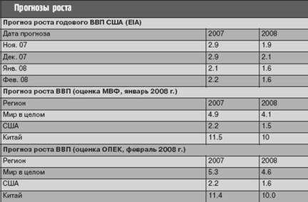 "Медвежье" настроение мировой экономики. Мировая конъюнктура остается нестабильной ввиду негативных показателей экономики США за декабрь и январь. Наиболее тревожным сигналом явилось резкое падение индекса деловой активности ISM в январе ниже критического уровня (50 пунктов) с 54.4 до 41.9, чего не наблюдалось со времени рецессии в 2001 году. "Медвежьему" настроению способствуют также слабые экономические показатели Евросоюза и Японии последних месяцев. Наметился переток капитала с финансовых рынков в товарные. Эта цепь событий провоцирует ослабление мировой валюты и рост цен на товарных рынках, в том числе нефтяном. В январе ФРС США дважды снижала ключевую процентную ставку с 4,75 до 3,5%. По мнению экспертов, это не решит принципиальных проблем в экономике США. Как следствие, повышаются риски снижения спроса на нефть, а вместе с ним и цен на нефть. Однако, как следует из оценки МВФ, проблемы в экономиках развитых государств приводят к резкому перетоку инвестиций в экономики с динамично формирущимся рынком, в т.ч. в Индию и Китай, на долю которых в перспективе будет приходиться значительный рост спроса на нефть. Это подтверждают оценки мировых агентств по росту ВВП в 2007 - 2008 годов.