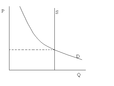Распределение национального дохода определяется ценами на факторы производства. Цена фактора производства представляет собой количество денег, уплаченное за единицу фактора производства - заработную плату работников, или доход, полученный собственниками капитала. Так как мы исходим из предложения, что количества факторов производства в экономике не известны, кривая предложения фактора приобретает вид вертикальной линии. Точка пересечения наклонной вниз кривой спроса на фактор производства с вертикальной кривой предложения определяет равновесную цену этого фактора производства.