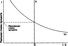 На рис. представлены графики сбережений и инвестиций как функции от ставки процента. Функция сбережений - это вертикальная линия, потому что в данной модели сбережения не зависят от ставки процента. График инвестиционной функции наклонен вниз: чем выше ставка процента, тем меньшее число инвестиционных проектов прибыльно.