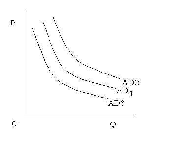 Потребительские расходы. Потребители могут изменить характер закупок отечественных товаров независимо от изменений в уровне цен. В таком случае сместится вся кривая совокупного спроса. Она сдвинется влево от AD1 к AD3, как показано на рисунке, когда потребители примут решение покупать меньше товаров, чем раньше, при данном уровне цен. И наоборот, кривая сместится вправо от AD1 к AD2, когда потребители примут решение увеличить объем закупок при данном уровне цен.