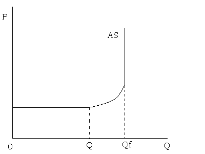 Кейнсианский (горизонтальный) отрезок. На рисунке Qf обозначает потенциальный уровень реального объема национального производства при полной занятости. Естественный уровень безработицы возникает при этом объеме национального продукта. Горизонтальный отрезок кривой совокупного предложения включает реальный объем национального производства, который значительно меньше, чем объем национального производства при полной занятости, Qf. Следовательно, горизонтальный отрезок свидетельствует о том, что экономика находится в состоянии глубокого спада или депрессии. Эти неиспользуемые ресурсы, как трудовые, так и материальные, можно привести в действие и при этом не оказать или почти не оказать никакого давления на уровень цен. Когда на этом отрезке объем национального продукта начинает увеличиваться, то ни дефицит, ни узкие места в производстве, могущие способствовать повышению цен, не возникают. Так как производители могут приобрести трудовые и другие ресурсы по твердым ценам, производственные издержки при расширении производства не возрастут, а следовательно, не будет оснований для повышения цен на товары. И наоборот, этот отрезок также предполагает, что если реальный объем производства сократится, то цены на товары и ресурсы останутся на том же уровне. Это значит, что реальный объем производства уменьшится, но цены на товары и заработная плата останутся неизменными.
