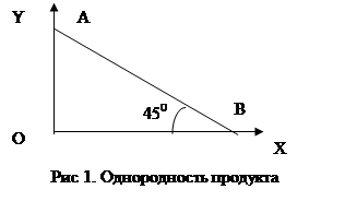 В терминах теории полезности однородность продукта означает, что продукты разных производителей полностью взаимозаменяемы для каждого покупателя, причем предельная норма замещения одного продукта другим равна единице. Например, замена в наборе апельсина одного производителя на апельсин другого производителя не изменяет полезности набора. В этом случае каждая кривая безразличия покупателя представляет собой отрезок прямой, наклоненный к осям координат под углом 450. На рис.1 кривая безразличия для продуктов двух разных производителей обозначена через АВ. Через X обозначено количество в наборе продукта первого производителя, а через Y – второго производителя.