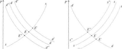 Уравновешивающую функцию выполняет цена, стимулируя рост предложения при дефиците и «разгружая» рынок от излишков, сдерживая предложение. Если спрос растет, то устанавливается новый, более высокий уровень равновесной цены и новый, больший объем предложения товаров. И наоборот, снижение спроса ведет к установлению более низкого уровня равновесной цены и меньшего объема предложения (рис. 5.6, а, б).