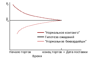 Гипотеза ожиданий Одно возможное объяснение заключается в гипотезе ожиданий (expectations hypothesis): текущая цена покупки фьючерсного контракта равна ожидаемой спотовой цене на дату поставки, или в виде символов: