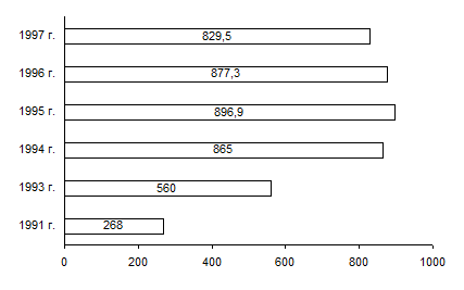 Рис. 1. Динамика численности малых предприятий в РФ в 1991 —1997 гг., тыс.