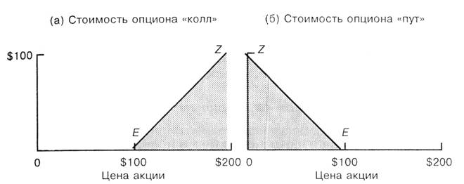 На рис. 1 (б) представлена стоимость опциона «пут» с ценой исполнения $100 при истечении. Если цена акции выше $100, то опцион не будет иметь стоимости. Если цена ниже $100, то опцион можно исполнить, чтобы получить $100 за акцию, которая стоит меньше, и, таким образом, получить чистый выигрыш, равный для покупателя опциона разности между $100 цены исполнения и рыночным курсом акции. Как и в случае с опционом «колл», ни покупатель, ни продавец опциона могут не связываться с реальными акциями. Продавец опциона «пут» может просто уплатить покупателю разницу между курсом акции и $100 цены исполнения.
