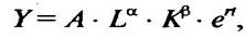 где Y — национальный продукт; L — труд; К — капитал; А — постоянный коэффициент, отражающий воздействие прочих факторов (его еще называют коэффициентом пропорциональности или масштабности); A и B — переменные коэффициенты эластичности соответственно по труду и капиталу. Причем A+B = 1, или B = 1 — A; еn — фактор, отражающий влияние качественных изменений в производстве, в том числе технического прогресса.