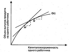 Обозначив показатели производительности труда (Y/L) и капиталовооруженности (К/L) соответственно через у и k, получим Уравнение у = f(k), где f(k) = F (k, 1). Это позволяет наблюдать изменение предельного продукта на одного работника в зависимости от кап италовооруженности (рис.1). Как видно из рис. 1, тангенс угла наклона графика производственной функции, выражающий величину предельной производительности капитала, уменьшается по мере подъема по кривой f(k) (точки М и N), что указывает на снижение предельной производительности капитала по мере его возрастания.