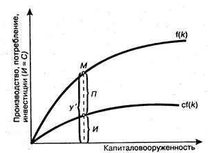 Имея производственную функцию у = f(k) и функцию потребления, преобразованную в функцию инвестиций и = су, можно представить инвестиции на одного работника как функцию от капиталовооруженности (фондовооруженности);