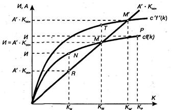 работника ( ∆ k) зависит от выбьггия и от инвестиций: ∆ k = И — А. Учитывая, что И = С, данное уравнение приобретает следующий вид: ∆ k= cf(k) — А. Как уже отмечалось, инвестиции увеличивают запас капитала, амортизация (выбытие) его сокращает. Следовательно, величина капитала и капиталовооруженность не будут изменяться в том случае, если инвестиции и выбытие будут сбалансированы, т.е. инвестиции будут равны амортизации (И = А). Это значит, что на графи ке (рис. 3) кривая выбытия (А'. Косн) и кривая инвестиций [cf(k)] должны будут пересечься в точке М, где инвестиции равны выбытию, а капиталовооруженность остается неизменной. Поскольку выбытие капитала идет равномерно, линия А' Косн имеет постоянный угол наклона. Несмотря на это, норма сбережений (С), объем инвестиций (И) изменяются не-равномерно ввиду неравенства значений объема выпуска при различных уровнях капиталовооруженности.