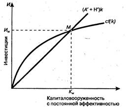 Новый график (рис. 6) отличается от предыдущего только включением дополнительного элемента — технического прогресса. Под воздействием роста технического прогресса требуется меньший объем капитала (К). При устойчивом состоянии экономики инвестиции [сf(k)] в точности компенсируют уменьшение К вследствие его выбытия, роста населения и технического прогресса.