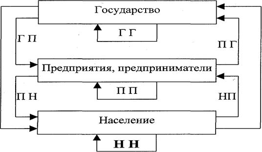 За каждой из указанной на схеме стрелок стоит множество разнообразных финансовых связей, потоков, отношений. Основываясь на общей схеме финансовых потоков между экономическими агентами, рассмотрим отдельные, наиболее представительные связи и финансовые отношения на разных уровнях. К ним относятся: "государство-предприятие" (ГП), "предприятие-государство" (ПГ), "государство-государство" (ГГ), "предприятие-население" (ПН), "население-государство" (НГ), "население-предприятие" (НП), "предприятие-предприятие" (ПП), "население-население" (НН), "государство-население" (ГН). Связь "государство-государство" характеризует перераспределение, переток денежных средств из одних каналов государственного бюджета в другие. Связь "предприятие-предприятие" отражает финансовые потоки между предприятиями, а связь "население-население" определяет движение денежных средств между отдельными группами населения.