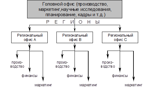 Некоторые фирмы используют региональный принцип управления (рис. 4). Такая структура широко используется, например, нефтяными фирмами. Как показывает рис. 4, управление осуществляется через региональные офисы, каждый из которых имеет соответствующие функциональные отделы.