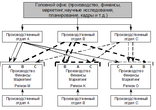 Каждая из перечисленных структур управления имеет свои преимущества и недостатки. Функциональная структура позволяет контролировать реализацию определенных функций – производство, маркетинг, финансы – относительно небольшим числом менеджеров. Но функциональная структура затрудняет пространственную координацию деятельности и создает трудности во внедрении новых продуктов и передаче технологического опыта от головной компании к дочерним. Производственная структура облегчает внедрение новых технологий и новых продуктов в дочерних компаниях, но она увеличивает издержки управления, вызывая разрастание функциональных служб и необходимость координации в той или иной форме деятельности в территориальном разрезе. Региональная структура дает хорошую территориальную координацию, но за счет ослабления производственной координации и увеличения расходов на функциональные службы.