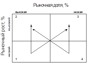На рис. 9 стрелки показывают направление денежного потока. Миссия «денежных коров» состоит в том, чтобы генерировать денежный поток, который может быть использован «тотализаторами» (вложение средств с целью расширения рыночной доли, а, следовательно, увеличения прибыли). Миссия «звезд» – сохранить свою конкурентоспособность. Миссия «собак» – создать положительный денежный поток, который будет направляться в другие виды предпринимательства и постепенно осуществлять дезинвестирование (прекращение их деятельности).