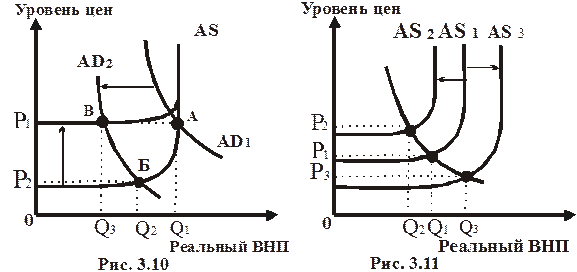 Если же совокупное предложение увеличится от AS1 до AS3, то новое макроэкономическое равновесие будет достигнуто при более высоком объеме реального ВНП (Q3) и более низком уровне цен (Р3).