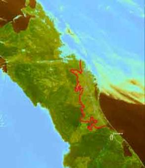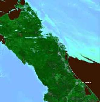 Пожары 1998 года в окрестностях Ногликов. Справа (рис. 3) показана схема размещения гарей по состоянию на 26.10.98. Снизу приведены различные синтезы 2-х канального снимка серии "Ресурс" от 07.07.98. На синтезированном снимке слева видны дороги и цепь населенных пунктов вдоль восточного побережья. На синтезированном снимке, представленном справа, видна большая, плохо зарастающая старая гарь севернее Ногликов, начинающаяся от дорог и поселков вдоль восточного побережья. Пожары 1998 годы в этом районе прошли преимущественно по старым гарям. Периодическое выгорание одних и тех же участков делает невозможным лесовосстановление. |