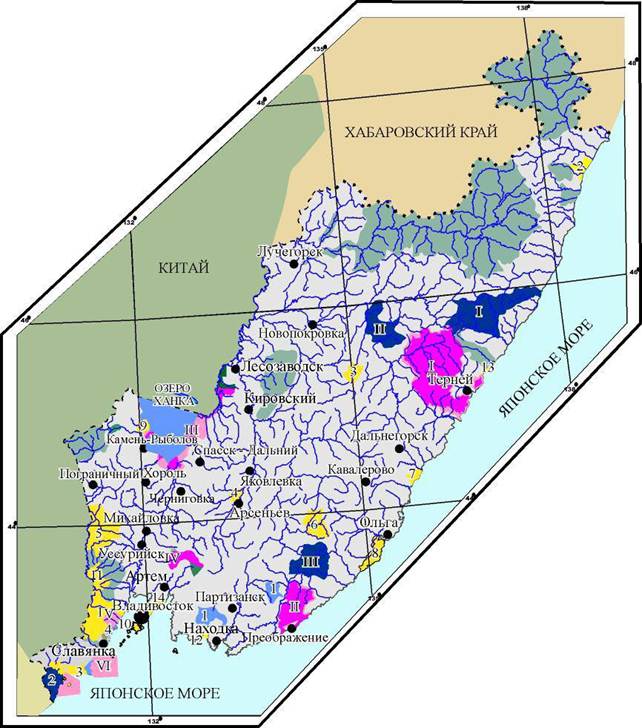 хребта Заповедного, пересекает среднее течение рек Черниговки и Соколовки севернее пос. Преображенского, вновь выходит к морю. Затем, от устья ключа Проселочного поворачивает на водораздел и материковые склоны хребта Заповедного, пересекает среднее течение Полярной Звезды, Перекатной и проходит вблизи пос. Лазо. Западная и юго-западная границы на склонах хребта Заповедного тянутся параллельно долине реки Киевки в ее среднем течении.