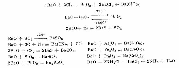 Растворяясь в воде, окись бария дает гидроокись бария Ba(OH)2. В отличие от окислов кальция и стронция окись бария при температуре 500° в заметных количествах поглощает двуокись углерода. На холоду окись бария взаимодействует с хлором, а при нагревании — с кислородом, серой, азотом, углеродом, двуокисью серы, сероуглеродом, двуокисью кремния, двуокисью свинца, окисью железа, хрома, а также с солями аммония: