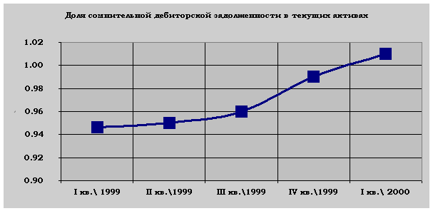 Как видно из таблицы доля сомнительной задолженности к текущим активам изменяется хаотично, резкие скачки, то уменьшение, то увеличение доли, это свидетельствует о нестабильной ликвидности дебиторской задолженности.