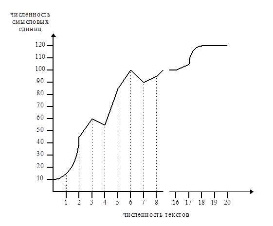 Из рисунка видно, что в итоге изучения 20 случайно отобранных из всего массива текстов было выделено суммарно 120 единиц контент-анализа, что исчерпывает “поле”, т.е. всю выборочную совокупность документов. Конечно, при изучении всего массива могут попасться новые смысловые единицы, относящиеся к предмету и ранее не предусмотренные. В этом случае они включаются в анализ дополнительно.