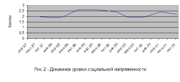 Приведем в качестве примера картину динамики уровня социальной напряженности в Санкт-Петербурге с апреля 1997 г. по октябрь 2001 г., определенную в результате социологического опроса (N=1300 каждый раз). В этот период замеры проводились регулярно, респонденты давали оценку различным проявлениям напряженности в рамках их территории (рис.2).
