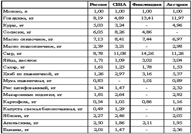 Корректные межстрановые сопоставления стоимостных показателей, в том числе и уровней номинальной оплаты труда, возможно проводить не на основе официальных обменных курсов валют, а с помощью паритета покупательной способности (ППС). По результатам международных сопоставлений валового внутреннего продукта России и других стран за 1996 г. соотношение ППС и валютного курса российского рубля составил 0,43 по доллару США, немецкой марки – 1,34, французского франка – 1,27. Таким образом, уровни затрат на рабочую силу в долларах США в пересчете по ППС в России относительно Германии составляли 23 %, Франции – 27 %, вместо 7 % и 9 % по счету через обменный курс соответственно.