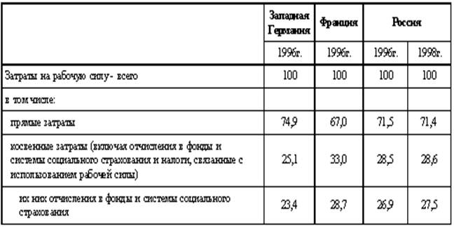 Таблица 3 Структура прямых и косвенных затрат на рабочую силу в промышленности (без электроэнергетики) в Западной Германии, Франции и России, в процентах к итогу