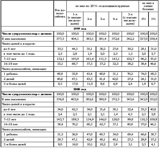 Приведенные данные показывают, что в 2000 г. по сравнению с 1999 г. отмечалось небольшое снижение числа детей у 20 % семей с низким уровнем среднедушевых доходов и некоторый рост – у 20 % семей с наиболее высоким уровнем доходов. Среди 5 % наиболее обеспеченных семей число супружеских пар, имеющих трех и более детей, выросло в 1,8 раза, а среди них – у 1 % самых богатых семей – в 5,9 раза.