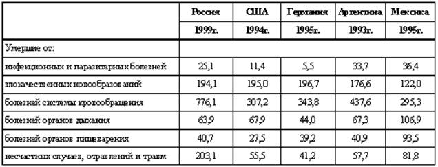На протяжении многих лет общие тенденции в смертности определяет ситуация со смертностью лиц в рабочих возрастах. Особенно велика смертность в данной категории среди мужчин. В развитых странах она в 2,4 раза ниже, чем в России. Во многом это связано с сохраняющимся высоким уровнем производственного и бытового травматизма. Так, за 1999 г. на 1 000 работающих мужчин приходилось более 7 пострадавших при несчастных случаях на производстве, что почти в 3 раза выше аналогичного показателя у женщин. В числе наиболее распространенных причин смерти мужчин трудоспособного возраста являются самоубийства, транспортные травмы, убийства и отравления алкоголем.