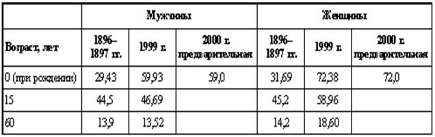Российский мужчина, достигший 60 лет, в дальнейшем, при сохранении современного повозрастного уровня смертности, может прожить еще около 14 лет, т. е. практически столько же, что и 100 лет назад (в конце XIX в.), у женщин показатель повысился всего на 4,5 года (табл. 6).