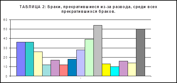 В нашей стране наряду со свободой брака существует и право супругов на развод. По статистике на 1990 год ещё в бывшем СССР ежегодно расторгалось примерно 930 тысяч браков (это приблизительно 1,5 % от их общего количества) и образовывалось 2788 тысяч новых семей. Таким образом, соотношение между браками и разводами составляет примерно 3:1. Но этот показатель различен в зависимости от места жительства и возраста людей. Так в больших городах разводов приходится больше чем в сельской местности. Так если посмотреть таблицу 2, мы видим, что наименьшее количество разводов приходится на регионы, где ещё сильны патриархально-религиозные традиции. Это среднеазиатские и кавказские республики.