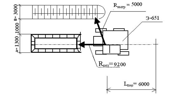 Rрез- наибольший радиус резания, (м); Lпер- длина рабочей передвижки экскаватор, (м); Rвыгр- наибольший радиус выгрузки, (м);В – ширина отвала грунта, (м)