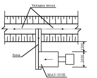 Песок доставляется с карьера самосвалами МАЗ-503Б и производиться разгрузка в траншею с помощью лотка.