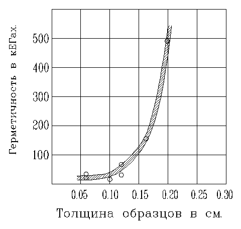 На рис.8-3 представлена кривая герметичности чугуна в зависимости от толщины стенки образца, построенная по данным таблицы 8-2.