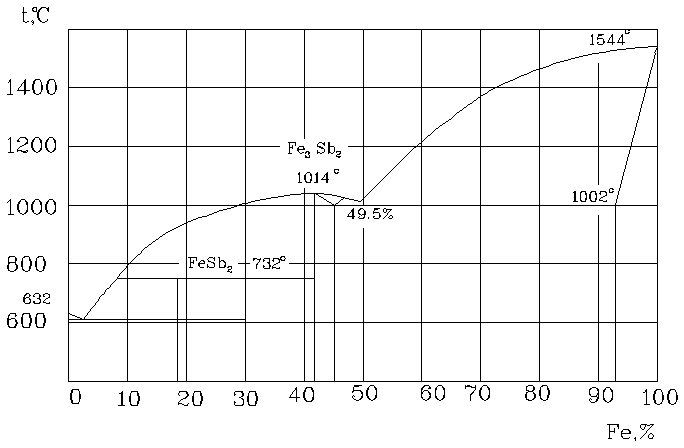 Из приведенной диаграммы состояния системы видно, что сурьма и железо в жидком состоянии полностью растворяются друг в друге образуя 2 химических соединения FeSb2 и Fe3Sb2. Температура плавления первого химического соединения равна 732 °С, а второго 1014. Железо в твердой сурьме не растворяется, а сурьма в твердом железе имеет ограниченную растворимость, до 5 % по весу. Сурьма сильно увеличивает интервал затвердевания твердого раствора. Один процент сурьмы понижает температуру начала затвердевания железа на 10.5 °С, а конец затвердевания на 105 °С [25].
