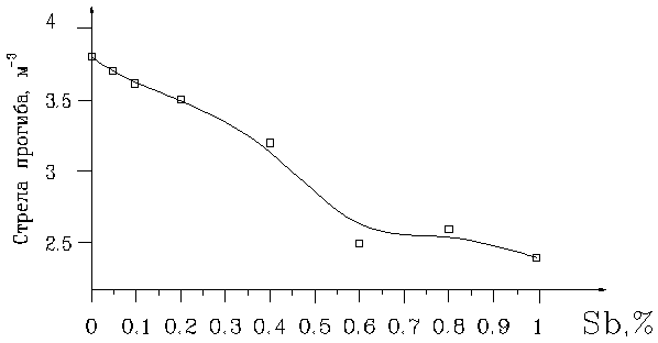 Из приведенных кривых видно, что с повышением присадки сурьмы прочность при изгибе, прочность при растяжении и стрела прогиба понижаются, а прочность при сжатии практически не изменяется.