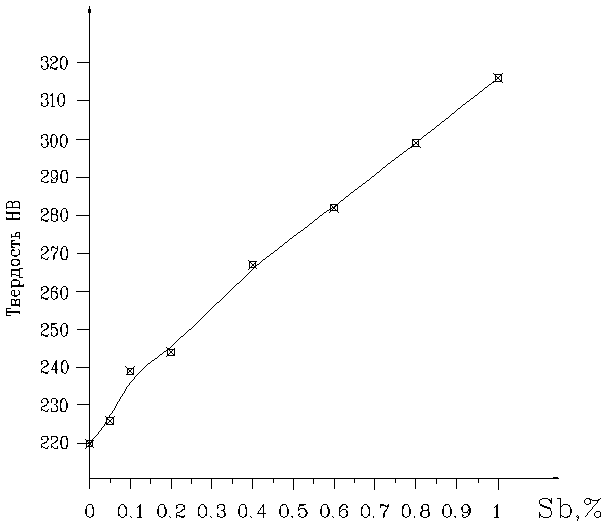 Твердость равномерно повышается и достигает 316 HB для чугунов с содержанием сурьмы 1.0 %.