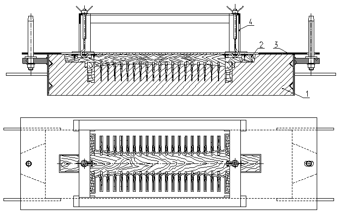 В связи с высоким рельефом и большой поверхностной площадью модели ее протяжка затруднена. При протяжке наблюдались обрывы формовочной смеси в межреберном пространстве и массовые засоры полости формы. Так как формовка осуществляется ручным способом, то в результате интенсивного расталкивания происходит износ и разрушение модели. Для снижения износа модели и улучшения качества формовки применили протяжной шаблон и специальное подъемное резьбовое приспособление для извлечения модели из формы (рис.2-4).