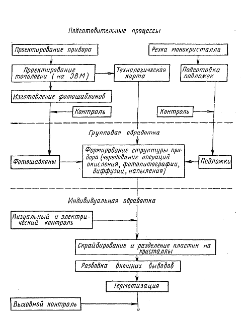 Общая технологическая схема процессов производства полупроводниковых приборов показана на рис. 1. Она включает комп лексы подготовительных процессов, процессов групповой и индивидуальной обработки.