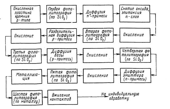 Формирование самой структуры прибора происходит при групповой обработке, которая состоит из процессов окисления, диффузии примесей, эпитаксии, вакуумного напыления, фотолитографии и технохимической обработки. Развернутая схема групповой обработки пластины при формировании прибора на примере эпитаксиально-планарной структуры представлена на рис. 2. Показанная на схеме часть технологического процесса изготовления приборов связана с одновременным получением множества идентичных структур (кристаллов) на одной полупроводниковой пластине. Цикл групповой обработки заканчивается получением межсоединений на поверхности кристаллов пластины.