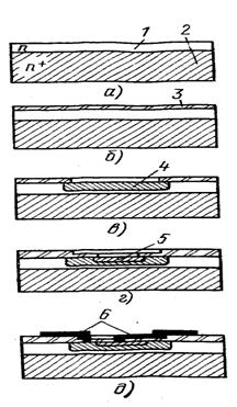 Рис. 3. Технологическая схема изготовления n-р-n-эпитаксиально-планарного кремниевого транзистора: а - исходная эпитаксиальая структура, б - структура с защитной оксидной пленкой, в - фотолитография и диффузия базы, г - окисление, фотолитография и диффузия эмиттера, д - формирование металлических контактов; 1 - эпитаксиальный слой, 2 - кремниевая пластина, 3 - защитная пленка оксида кремния, 4 - р-область базы. 5 - n -область эмиттера, 6 - металлические контакты