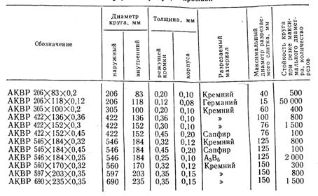 В связи с тем что диаметры слитков и механические свойства разрезаемых материалов разнообразны, используют круги АКВР различных типоразмеров. Характеристики наиболее распространенных из них приведены в табл-З.